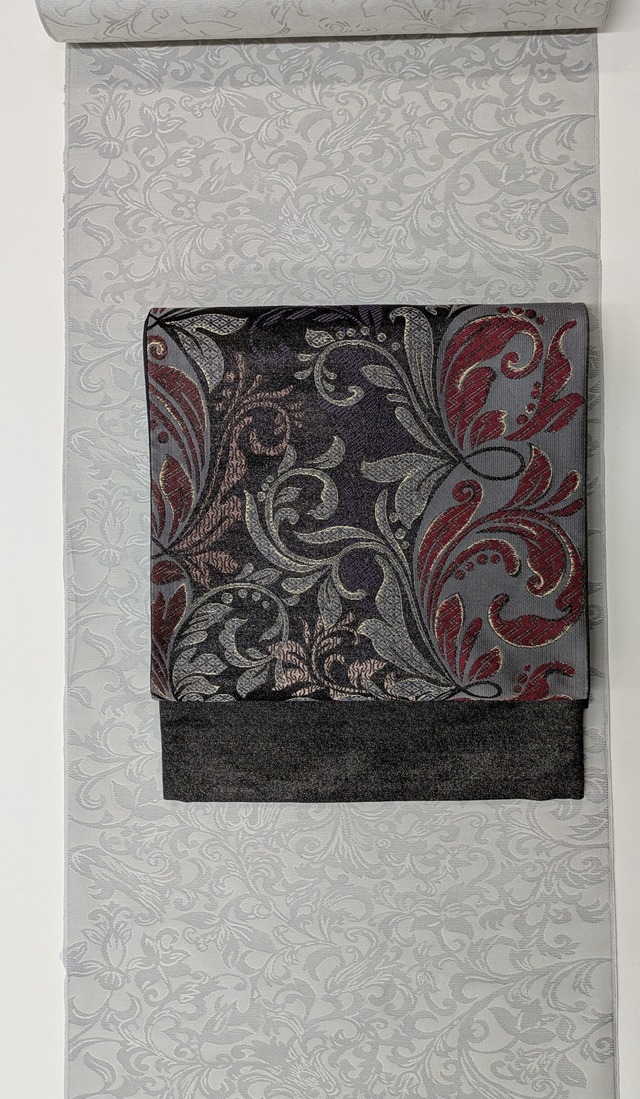 1892年創業、西陣織・小森織物さんによる袋帯です。 抑えた箔使いで墨色地のモダンな更紗柄です。 カジュアルからセミフォーマルまでお使いいただけます。 墨色、グレー、臙脂、紫のおしゃれな配色です。 透けないお単衣と袷にお使いいただけます。 絹100% 巾:8寸2分(約31cm) *帯芯&お仕立て代を含まないお値段です。 お仕立てご希望の方はご注文の際お書き添えくださいませ。 こちらから連絡させていただきます。 *お仕立ての必要がない場合、時間指定や日にち指定などございましたら ご注文の際にお書き添えください。 (勝手申しますが日・月・祝は定休日となっており発送することが出来ません。)