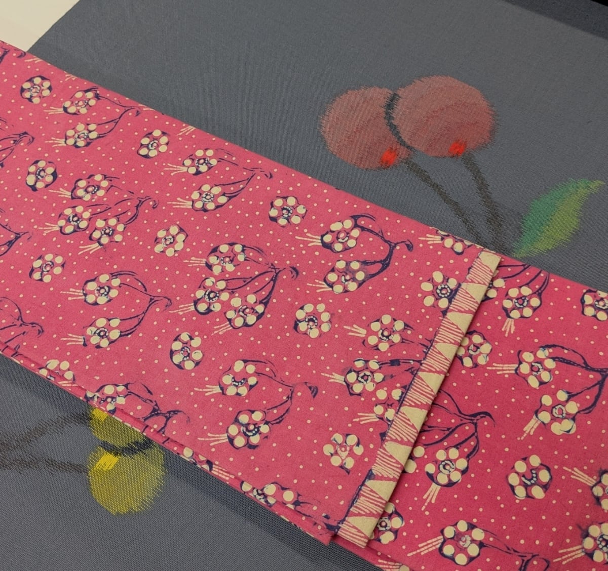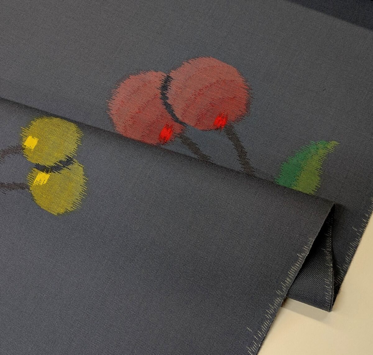 青みのグレー地に絣でサクランボの柄が織り出されています。