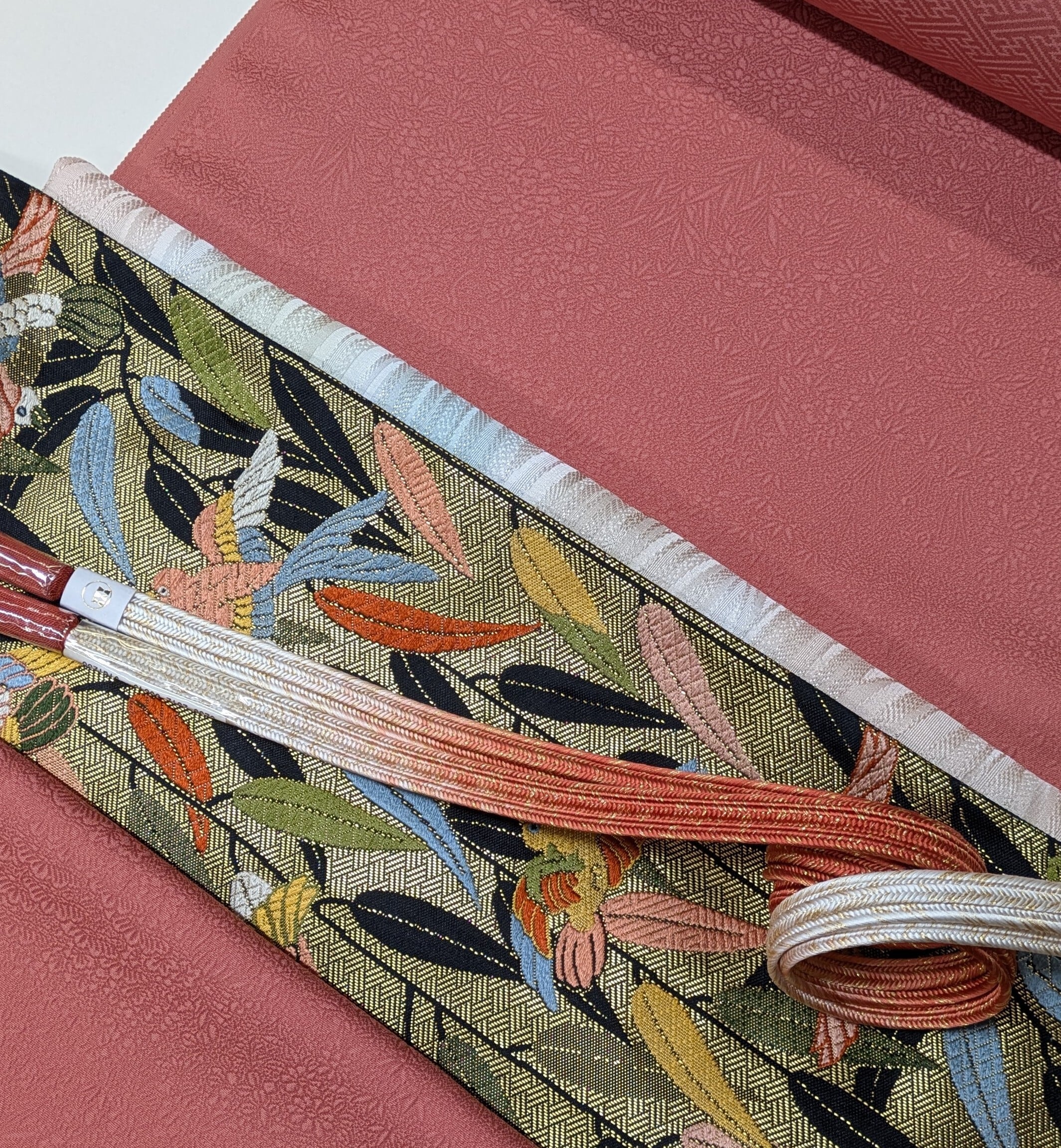 能装束風の柄で笹と鳥が織り出されています。