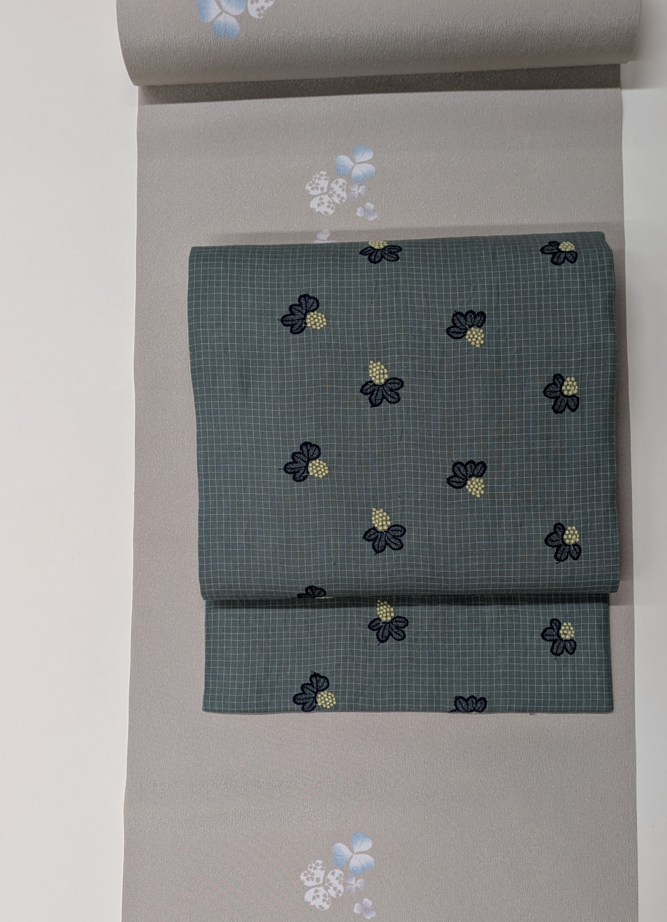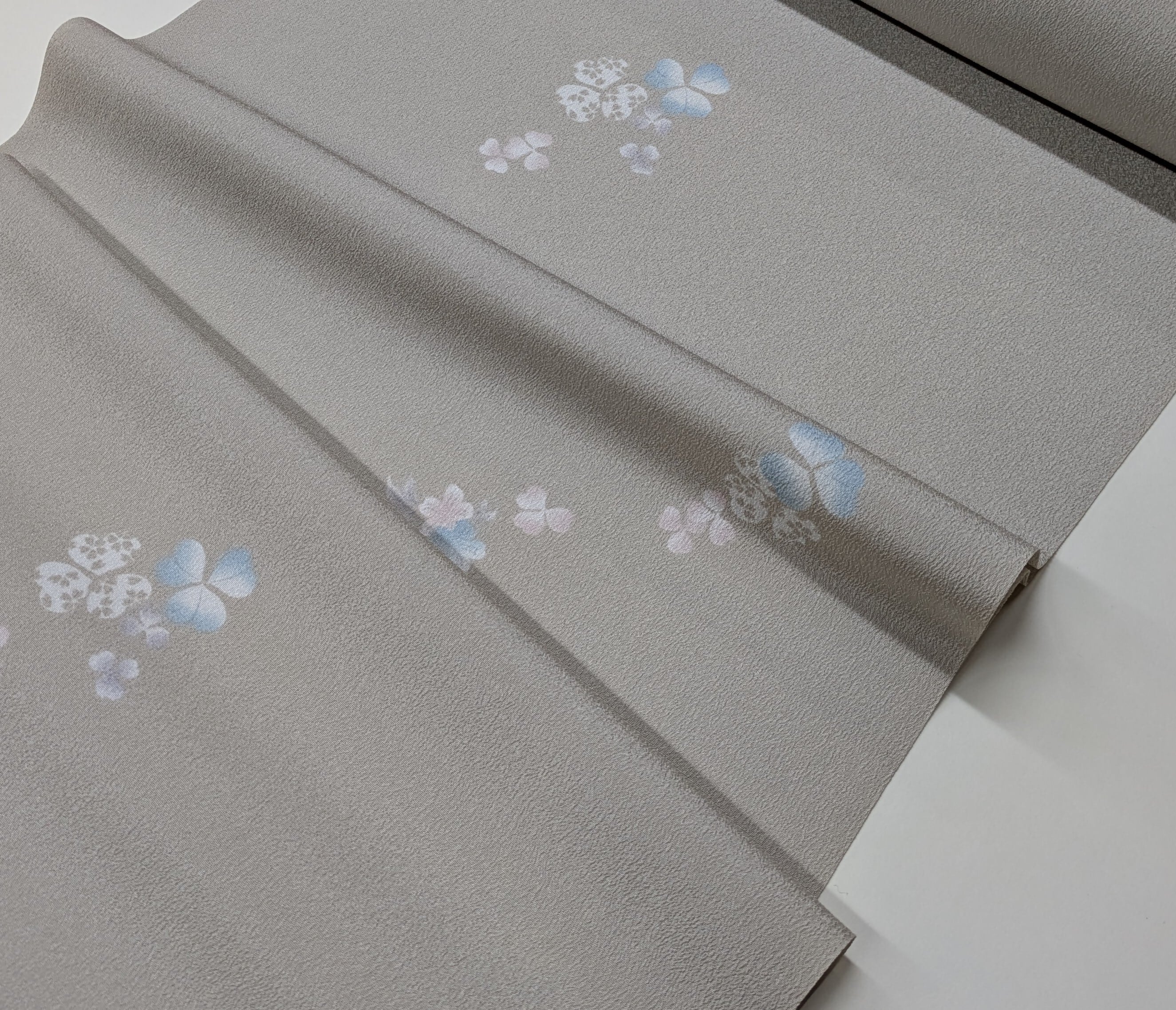 明るいグレージュの地色にカタバミと桜が飛び柄で染められています。