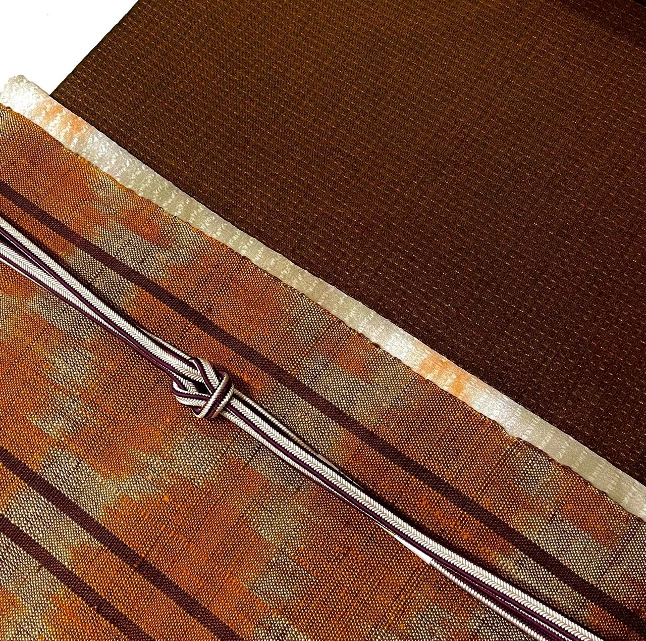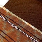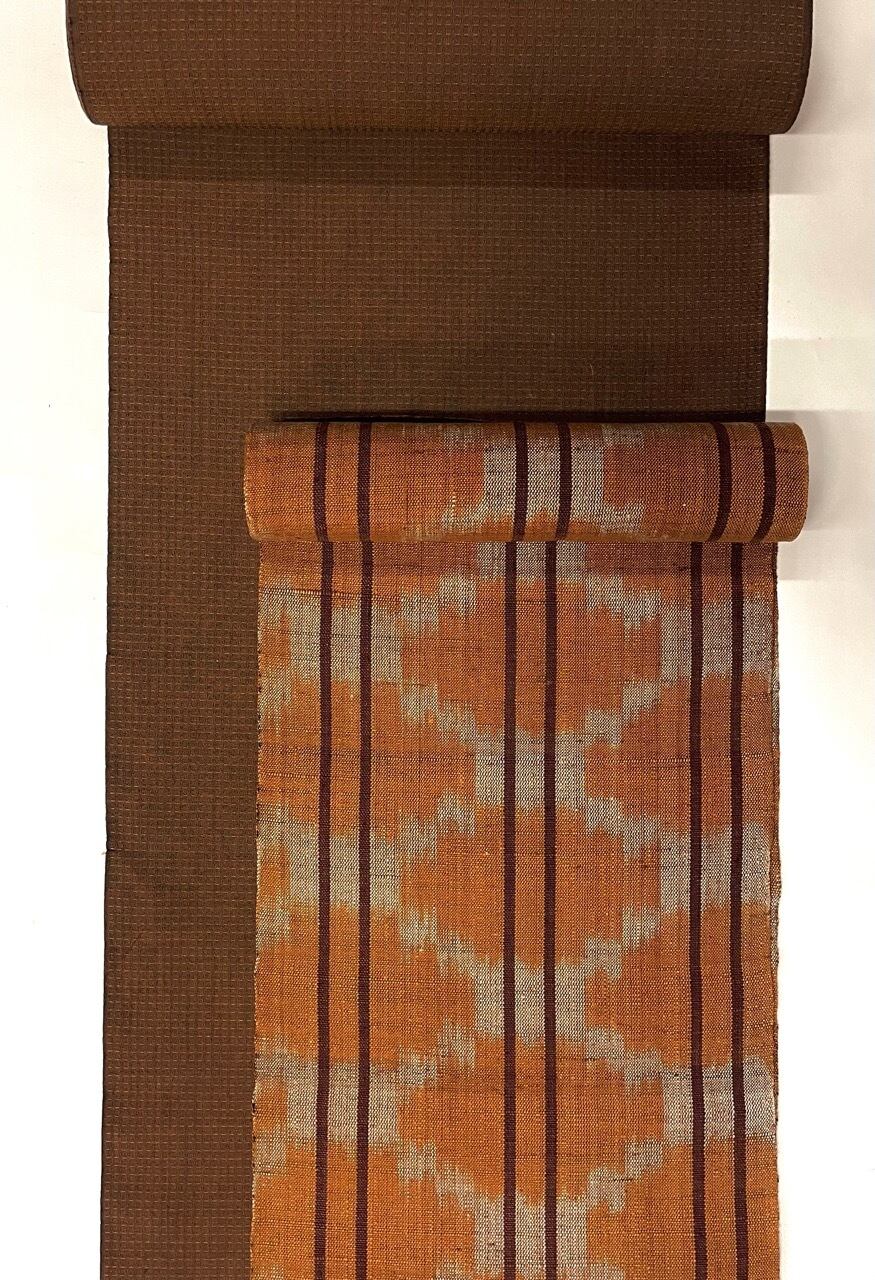 金茶色地に薄茶色で経絣の柄、海老茶色の経縞模様です。
