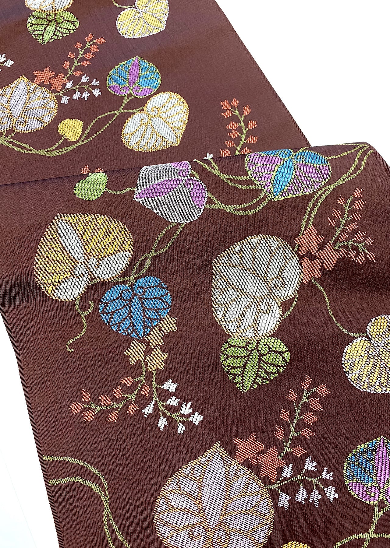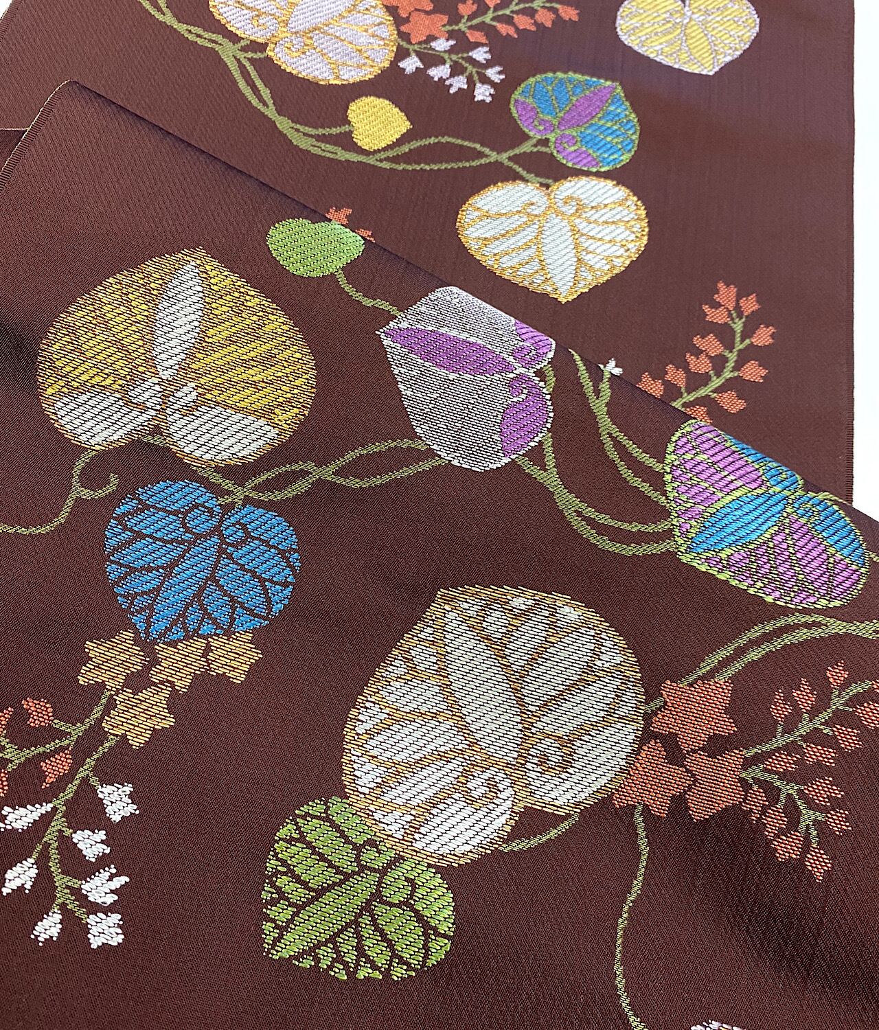 深い海老茶色の地色に葵の柄が六通で織り出されています。