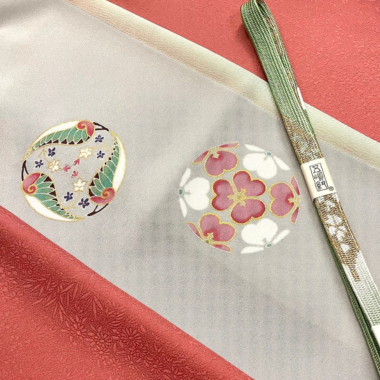 淡いグレー地に葵と竹とカタバミを紋様にデザインした柄の