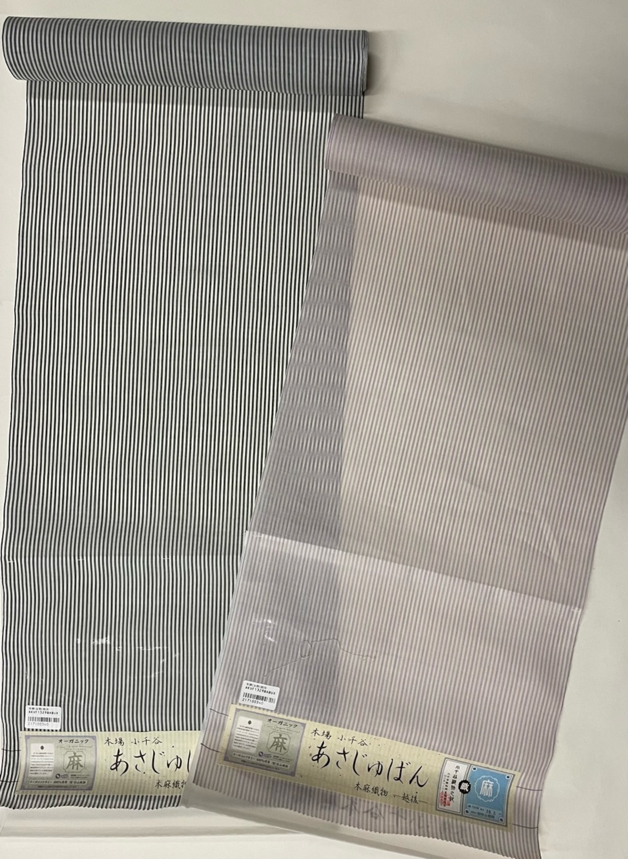 2㎜ほどの縞柄で白地にグレーと紫みのピンクの2色です。